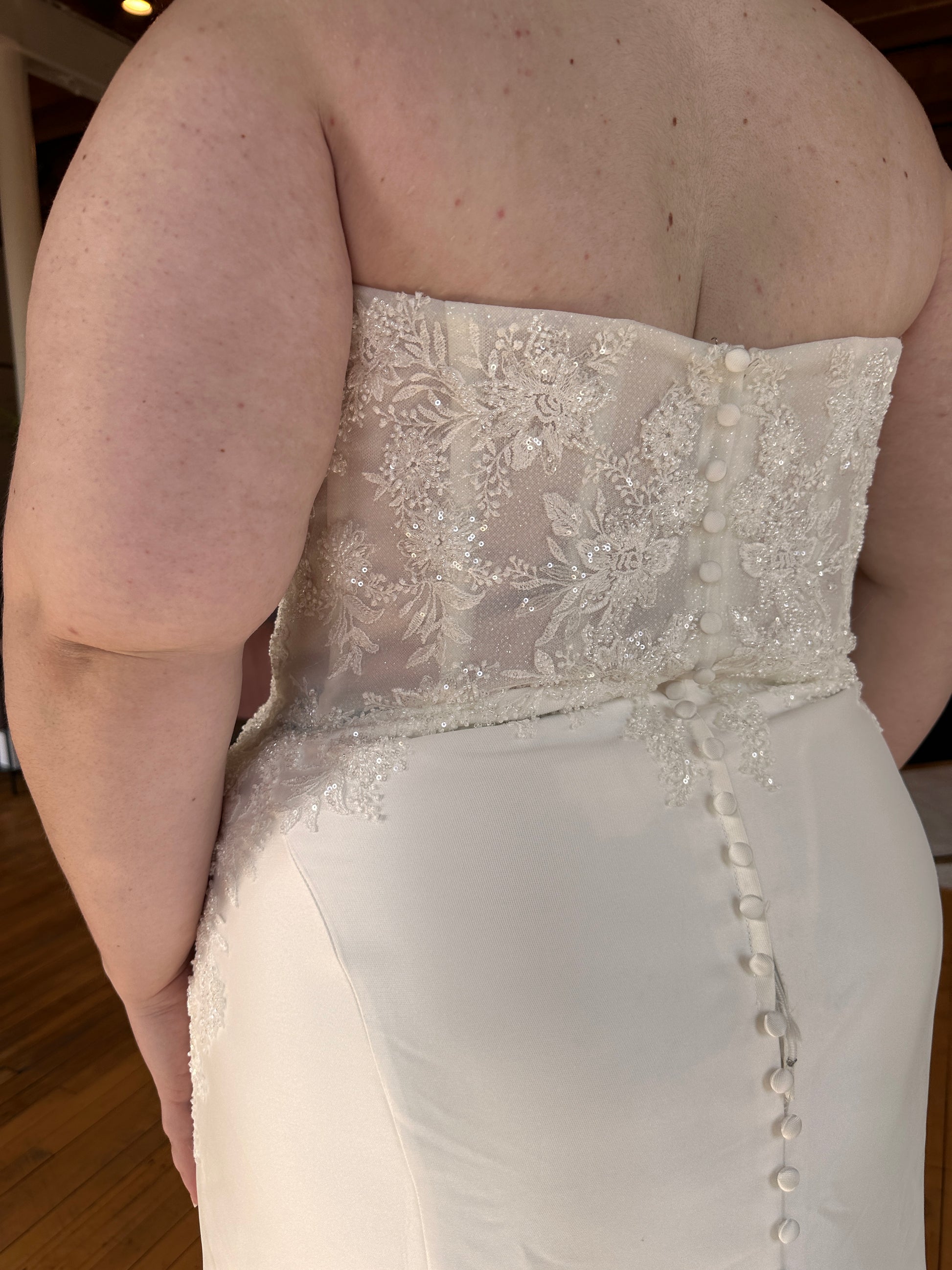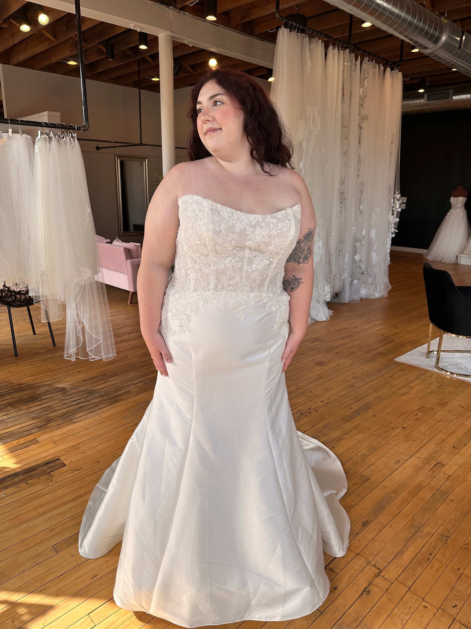 Please note: Our sample gowns have been lovingly tried on by brides during in-store appointments, but they’ve never been worn for a wedding day or left the boutique. As with all sample dresses, gentle wear and tear may be present, but each gown has been carefully cared for and is ready to begin its journey down the aisle with you.