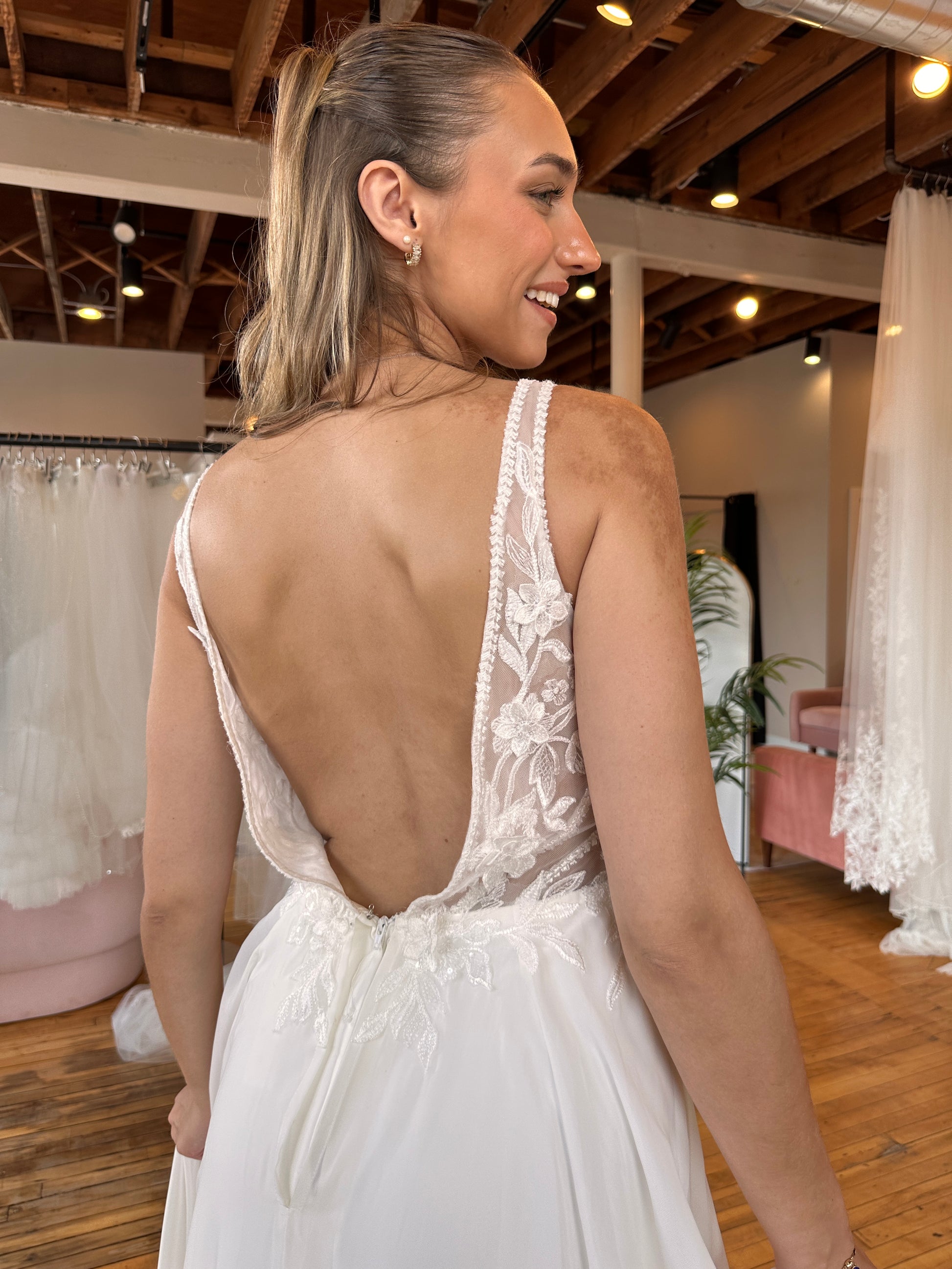 Please note: Our sample gowns have been lovingly tried on by brides during in-store appointments, but they’ve never been worn for a wedding day or left the boutique. As with all sample dresses, gentle wear and tear may be present, but each gown has been carefully cared for and is ready to begin its journey down the aisle with you.