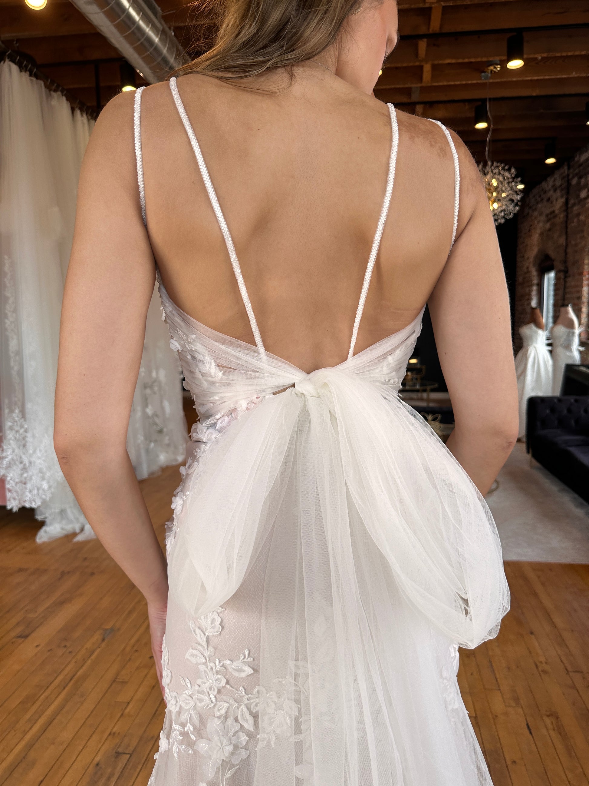 Please note: Our sample gowns have been lovingly tried on by brides during in-store appointments, but they’ve never been worn for a wedding day or left the boutique. As with all sample dresses, gentle wear and tear may be present, but each gown has been carefully cared for and is ready to begin its journey down the aisle with you.