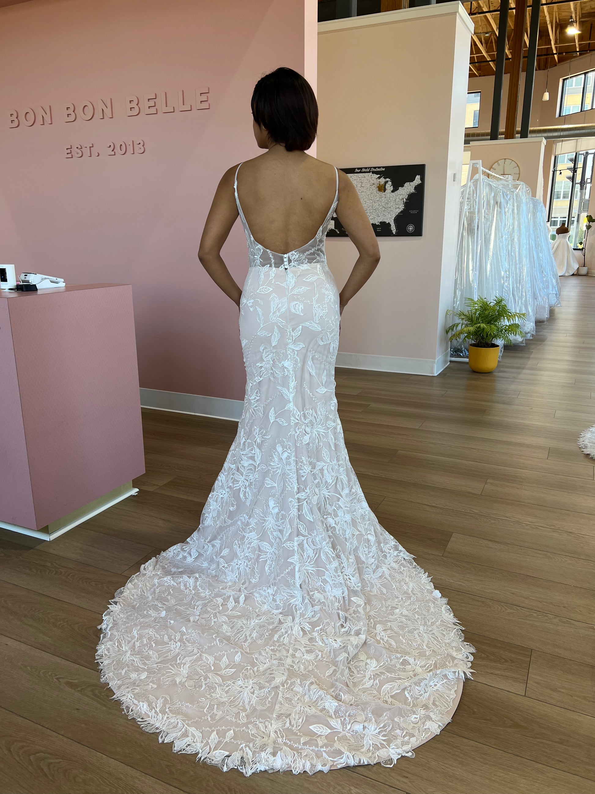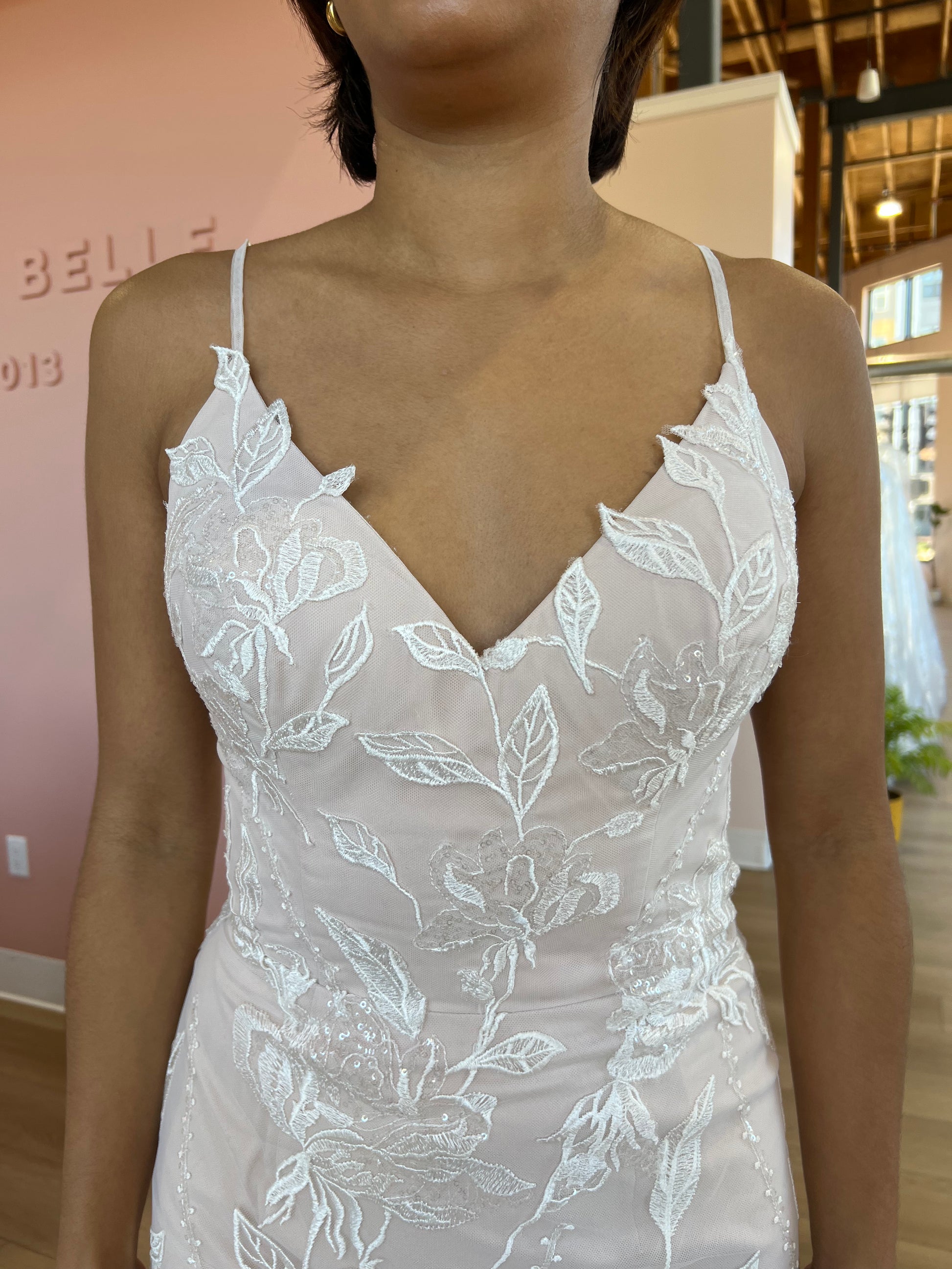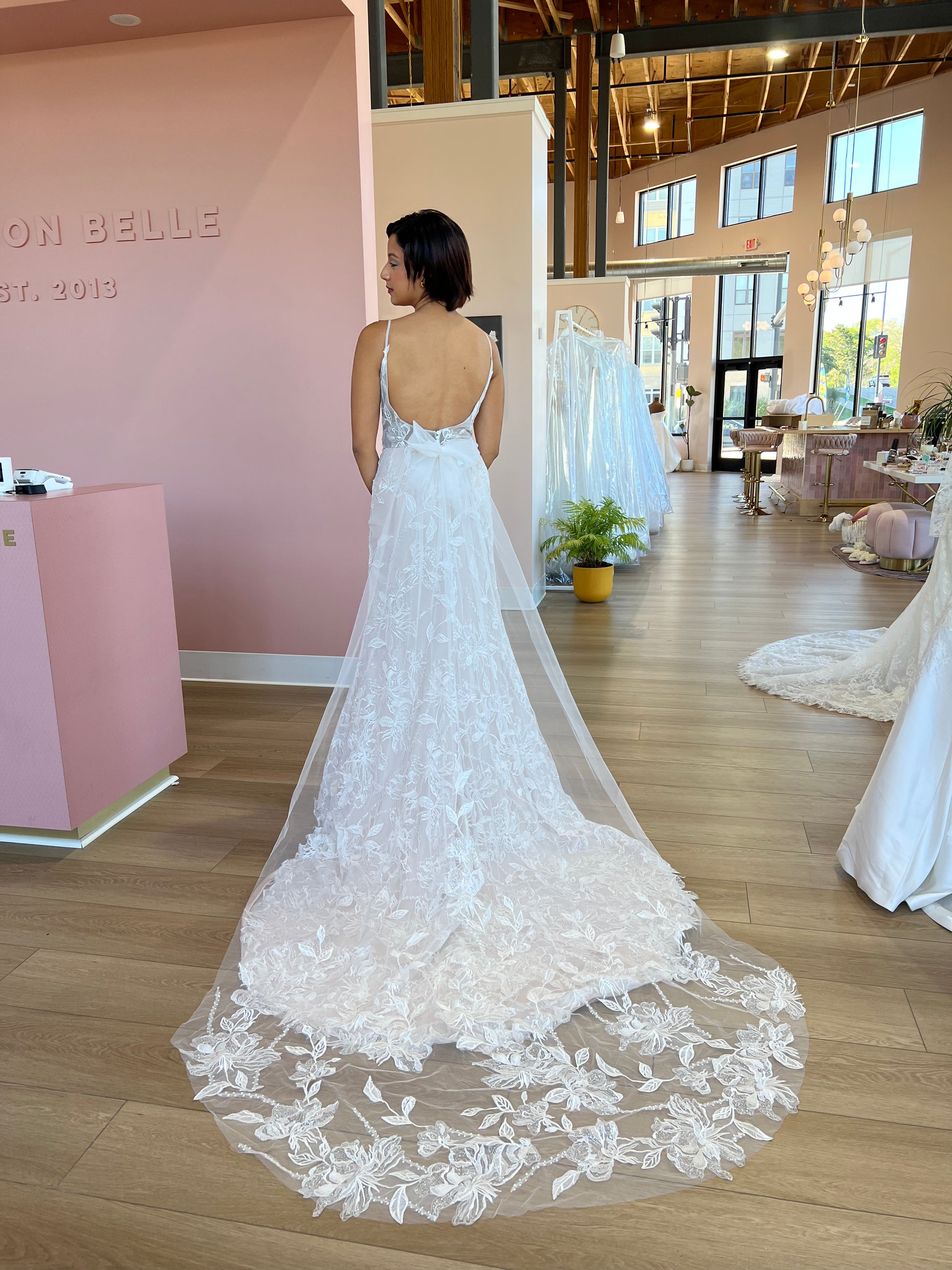 Please note: Our sample gowns have been lovingly tried on by brides during in-store appointments, but they’ve never been worn for a wedding day or left the boutique. As with all sample dresses, gentle wear and tear may be present, but each gown has been carefully cared for and is ready to begin its journey down the aisle with you.