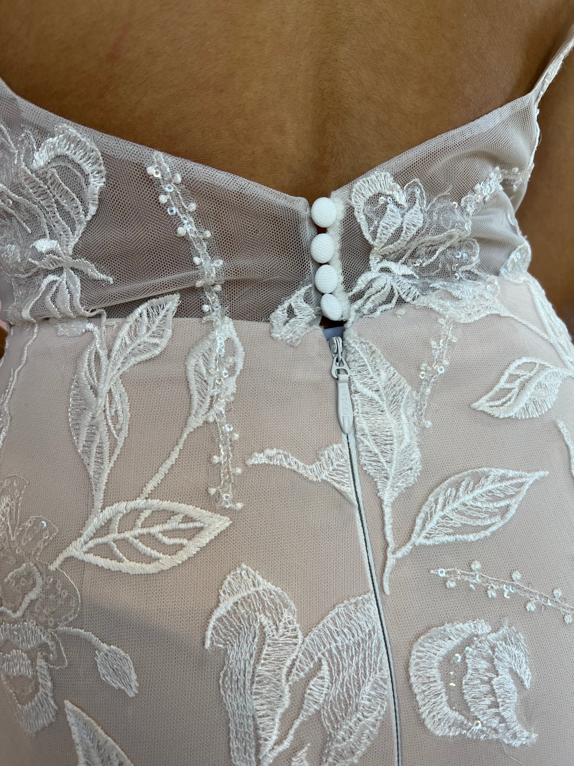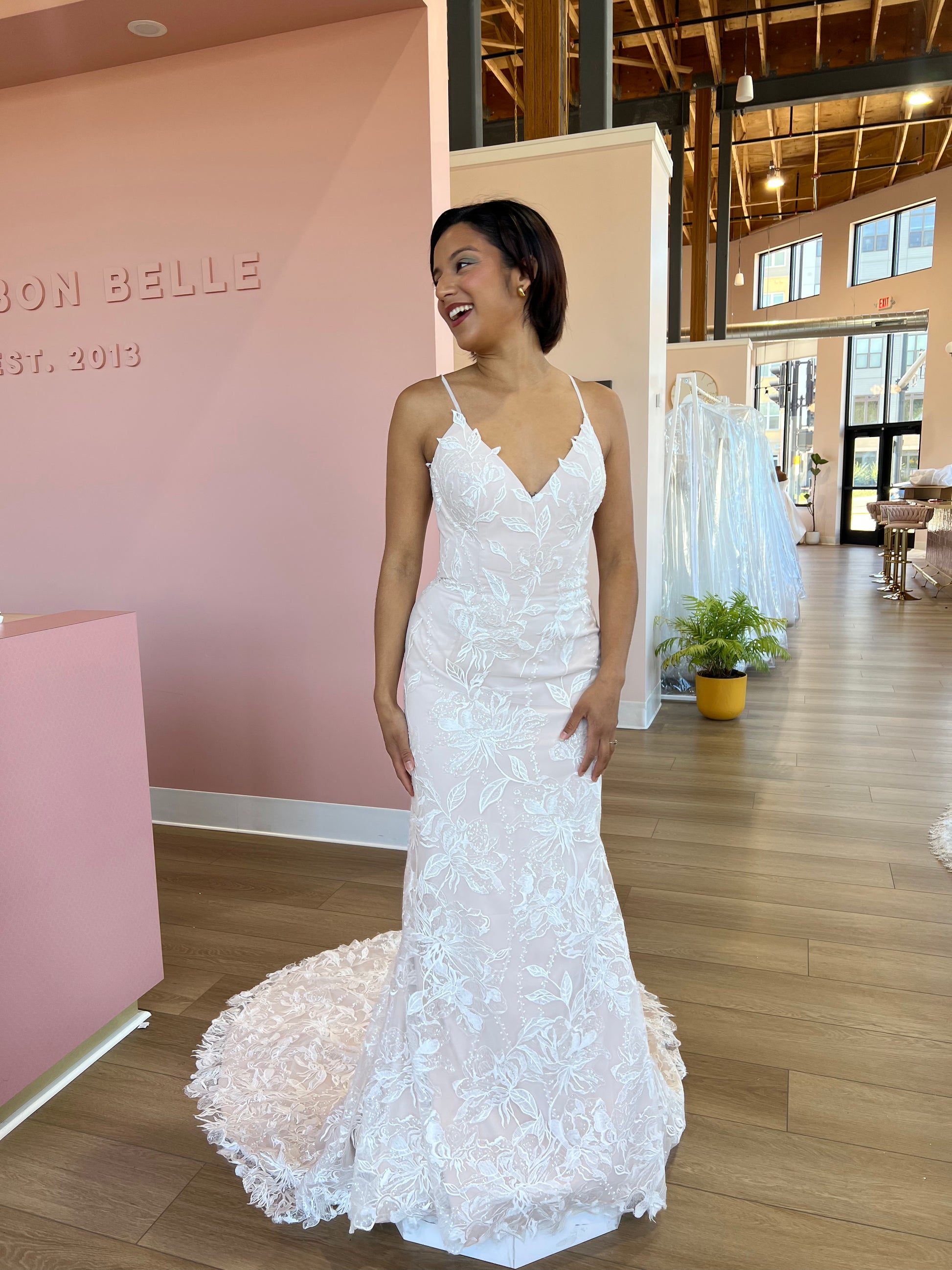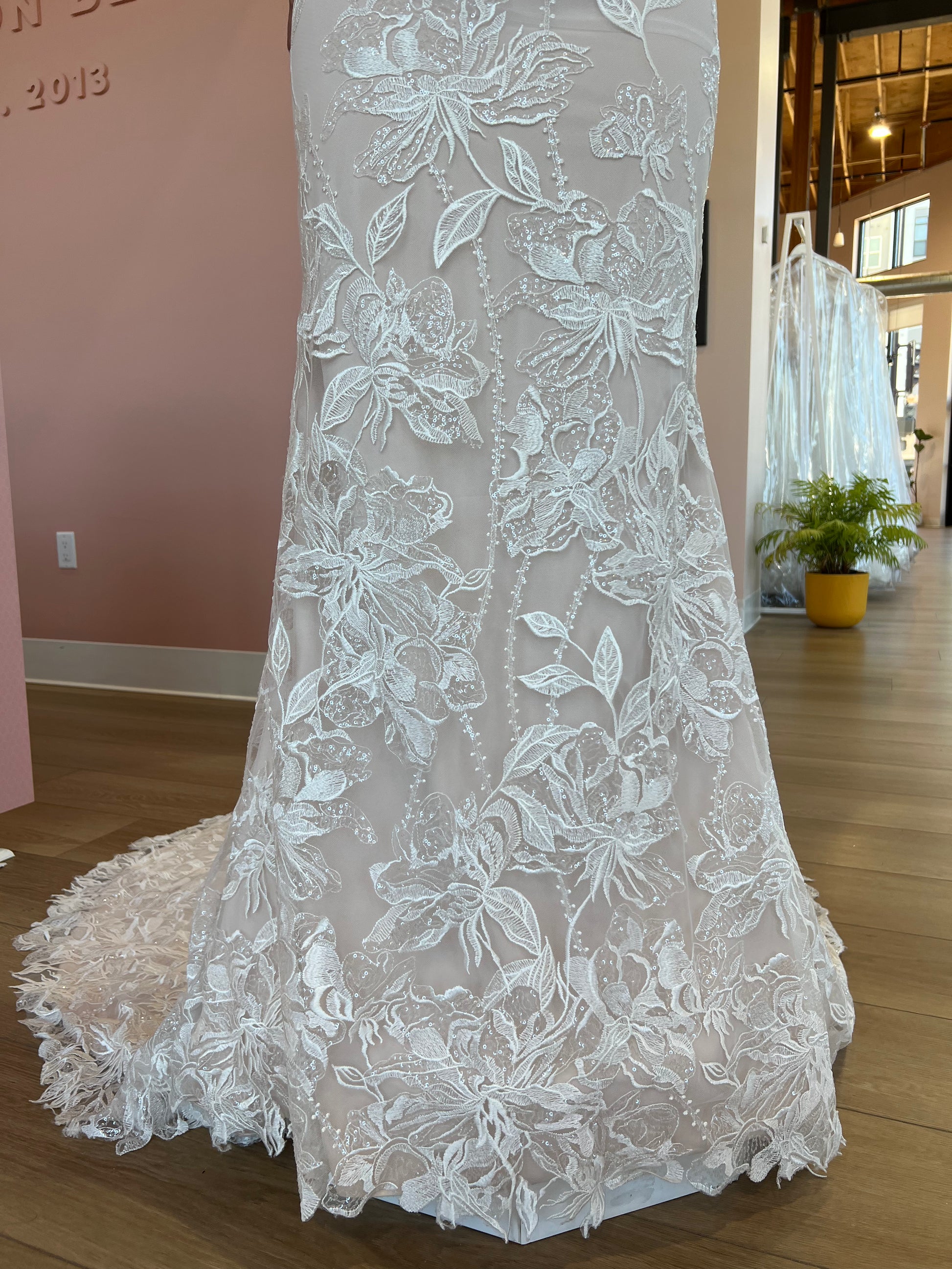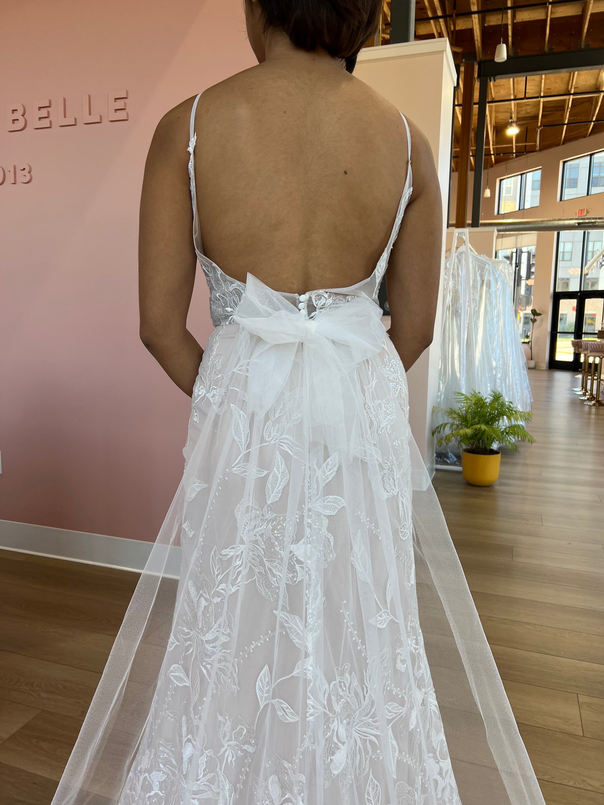Please note: Our sample gowns have been lovingly tried on by brides during in-store appointments, but they’ve never been worn for a wedding day or left the boutique. As with all sample dresses, gentle wear and tear may be present, but each gown has been carefully cared for and is ready to begin its journey down the aisle with you.